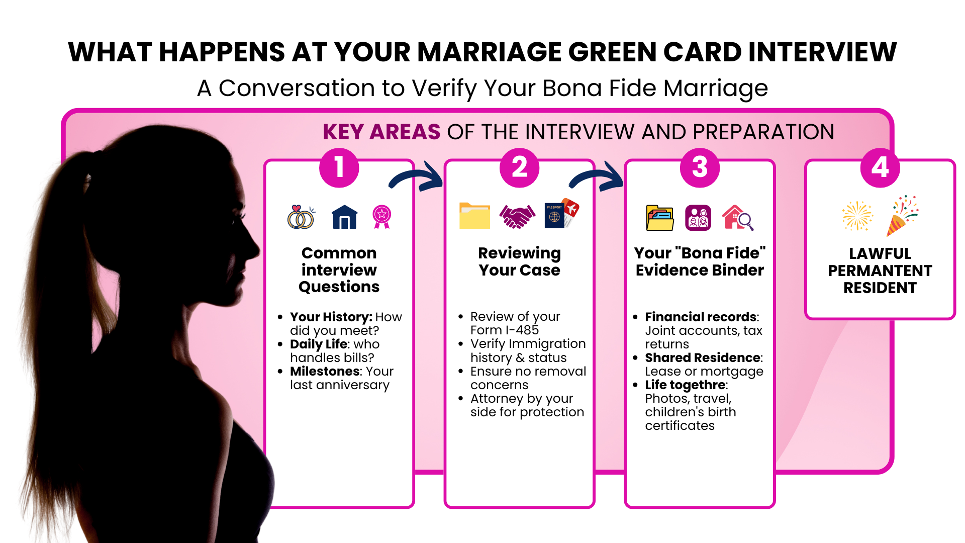 Proving your marriage is “Bona Fide”: We help you gather “bona fide” evidence proof, like joint bank accounts, photos, and letters from friends. This shows the USCIS officer that your marriage is based on love.