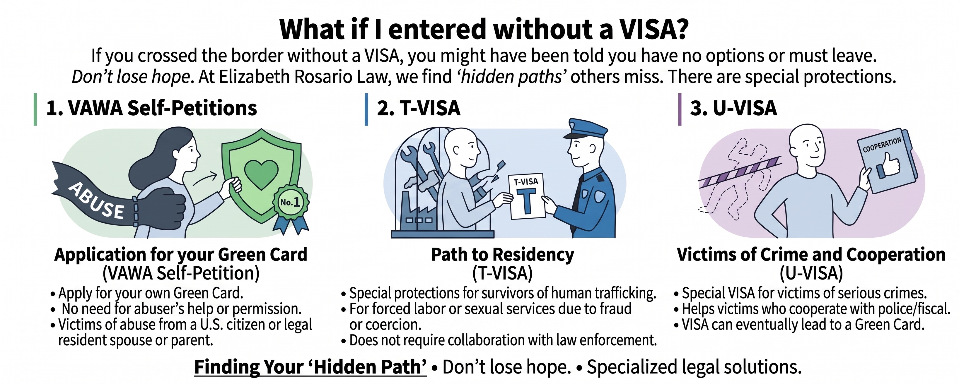If you crossed the border without a visa, people may have told you that you have no choice but to leave. Don't lose hope. At Elizabeth Rosario Law, we find “hidden paths” that other immigration attorneys might not see.