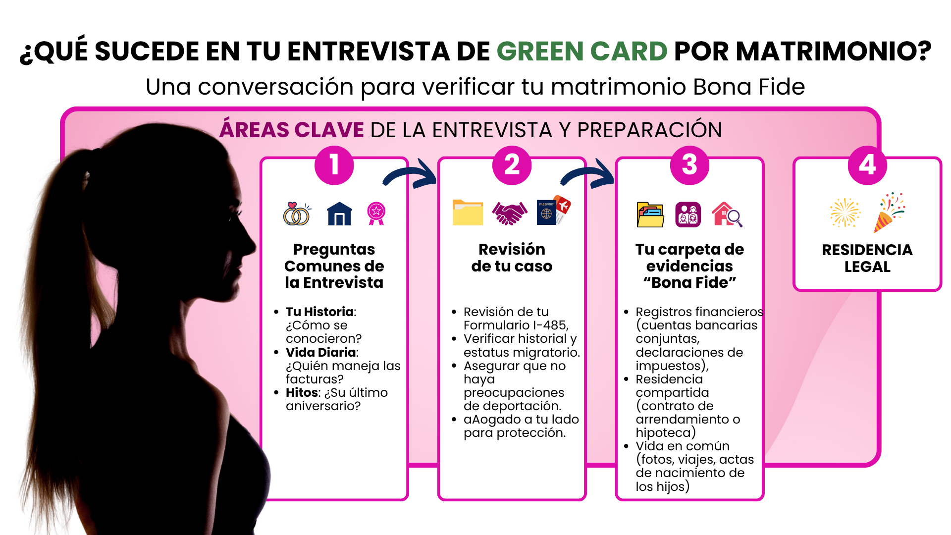 La entrevista: Este es el último paso. Tú y tu pareja platicarán con un oficial de USCIS sobre su vida juntos. (¡No te preocupes! Tu (futura) abogada de inmigración te preparará para cada posible pregunta).