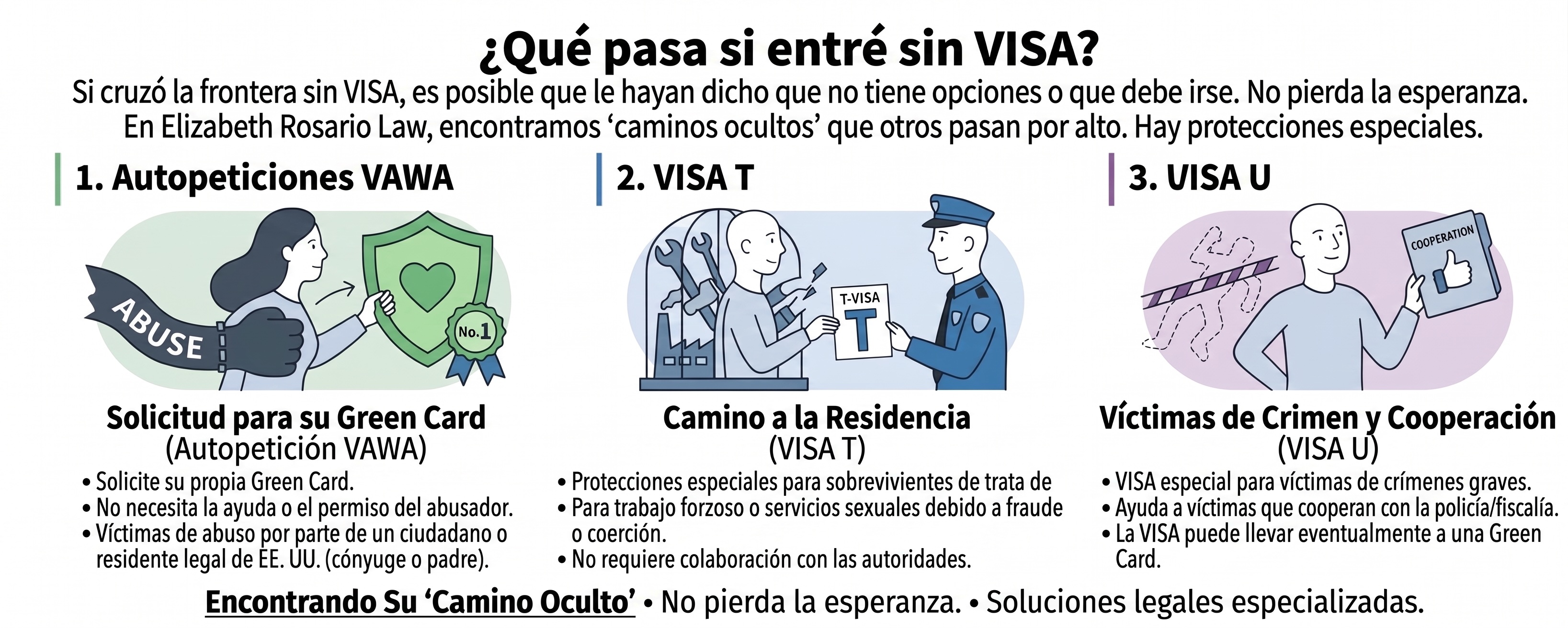 Si cruzaste la frontera sin documentos, tal vez te han dicho que no tienes de otra más que salir. No pierdas la esperanza. En Elizabeth Rosario Law, buscamos "caminos ocultos" que otros abogados de inmigración a veces no ven.