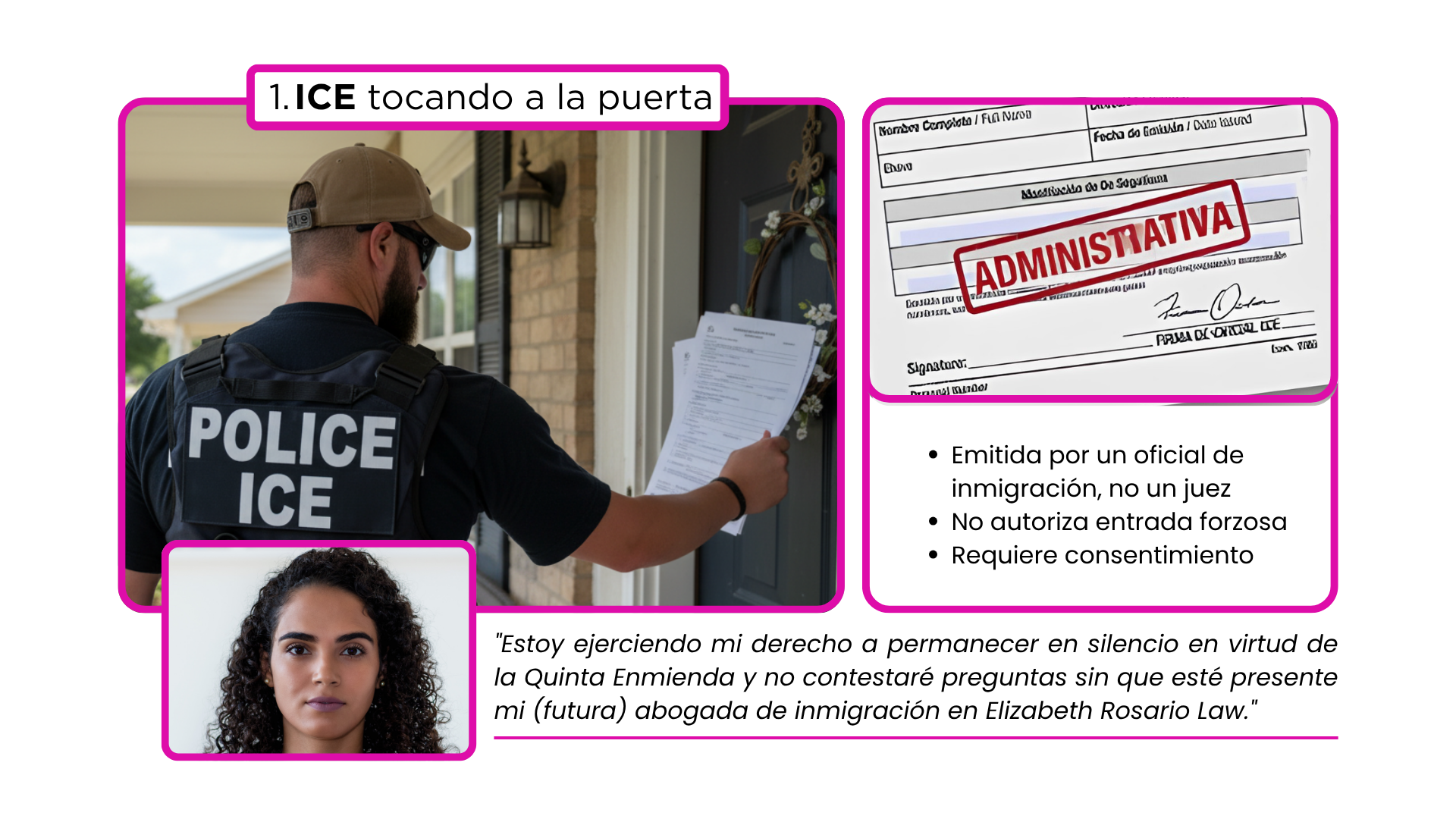 ¿Qué hacer?: Di con claridad: “Estoy ejerciendo mi derecho a un abogado y no firmaré ningún documento, ni responderé preguntas ni participaré en una entrevista hasta que haya consultado con mi (futuro) equipo legal en Elizabeth Rosario Law”.