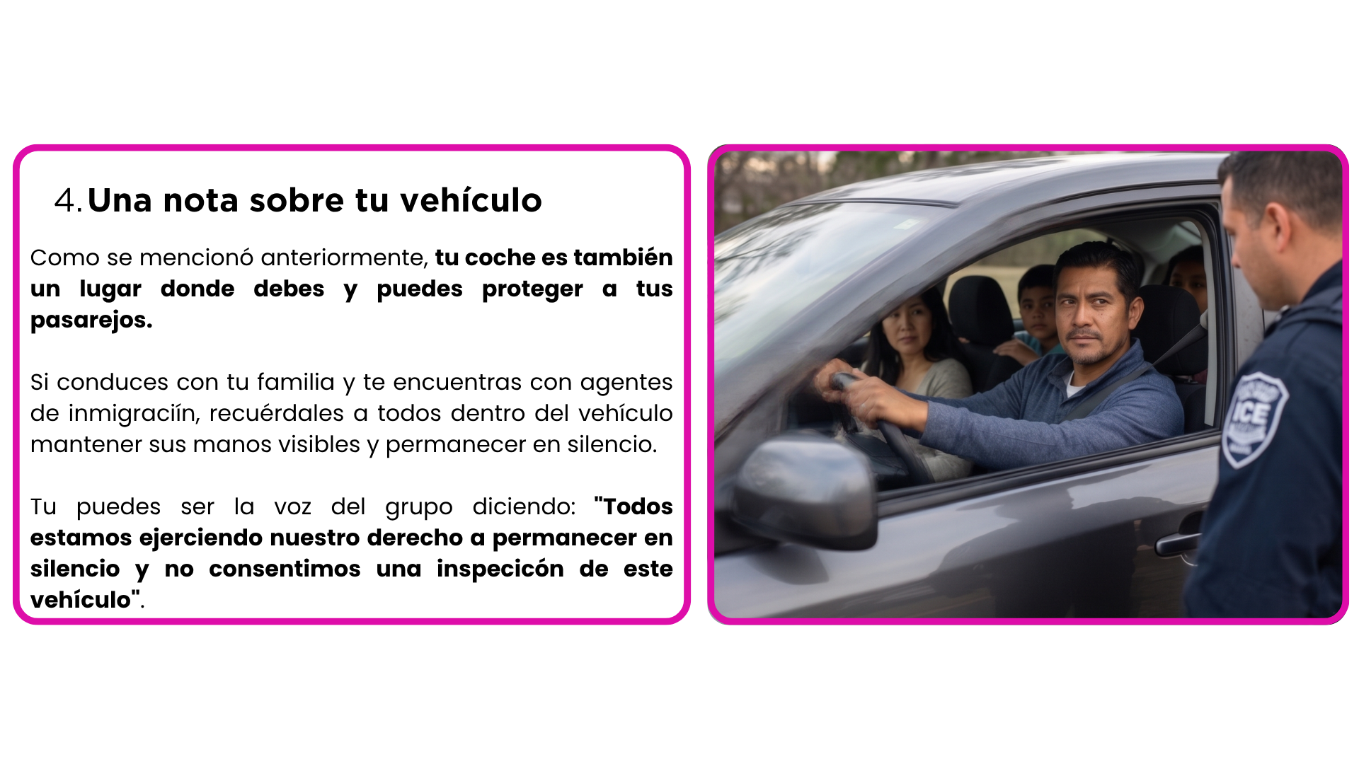 Como mencionamos antes, tu auto también es un lugar donde debes proteger a tus pasajeros. Si vas conduciendo con tu familia y se acercan agentes de ICE, recuérdales a todos que mantengan las manos visibles y guarden silencio. Tú puedes ser la voz del grupo diciendo: “Todos estamos ejerciendo nuestro derecho a permanecer en silencio y no damos el consentimiento para que registren este vehículo”.
