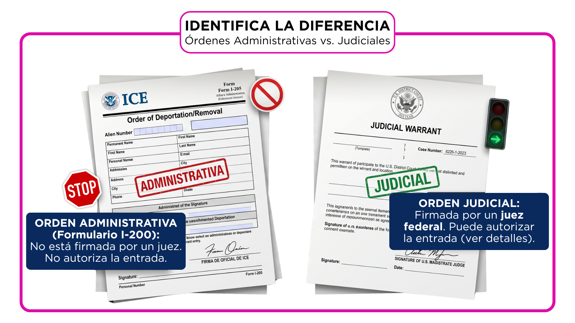 Una de las formas más comunes en que los agentes de inmigración presionan a las personas para que abran la puerta es aprovechando la confusión sobre las órdenes de registro. En ERL, nuestro objetivo es ayudarte a distinguir rápidamente la diferencia para que puedas protegerte. Aunque tanto las órdenes judiciales como las administrativas son documentos oficiales, se diferencian mucho en sus objetivos, las pruebas necesarias y quién las firma.