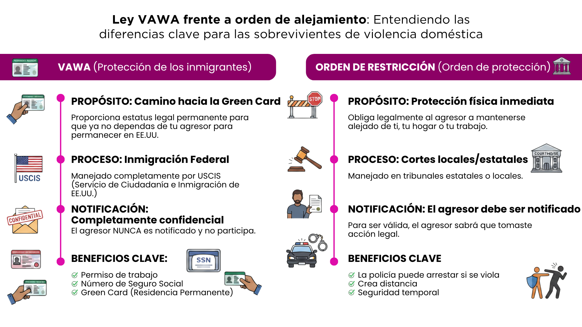 Piensa en una orden de restricción como un escudo físico para tu seguridad inmediata, mientras que VAWA es un escudo legal para tu futuro a largo plazo en este país.
