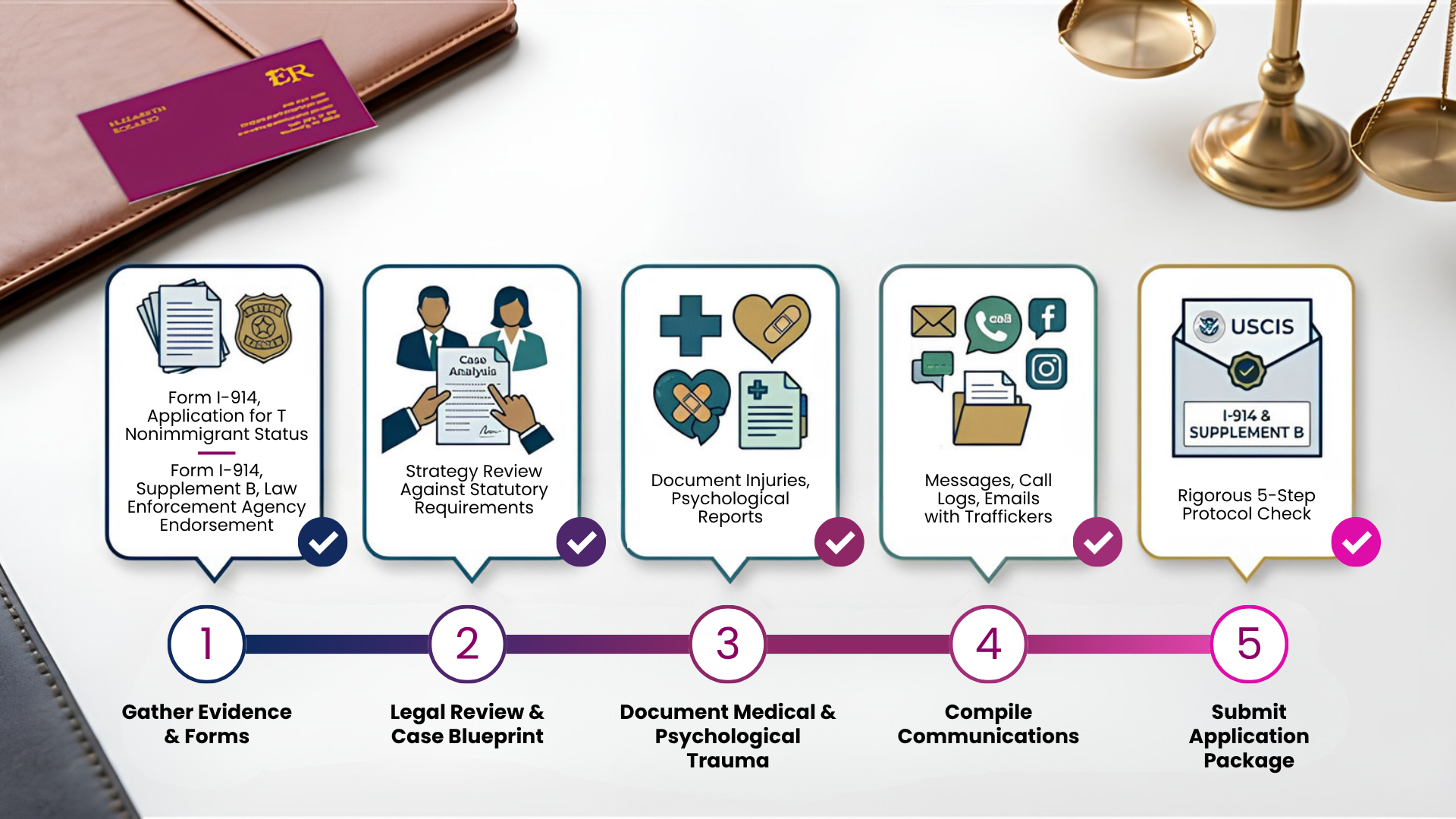At Elizabeth Rosario Law, we engineer outcomes. Our approach to T-Visa representation is built on three pillars:
