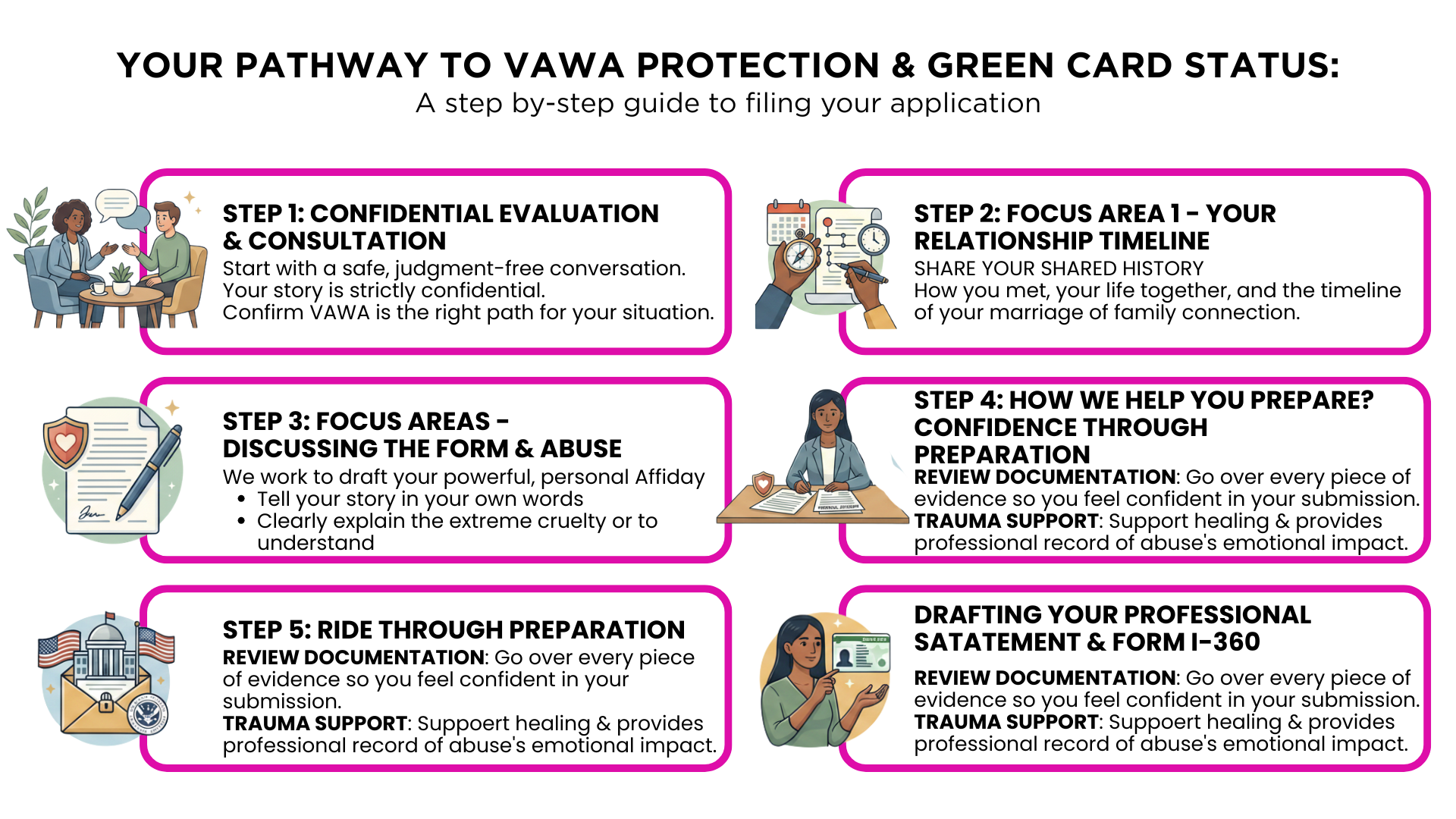 These protections exist because immigration attorneys understand that abusers often use a person's immigration status as a tool of “threat and control” VAWA is designed to take that tool away and give you back your voice.