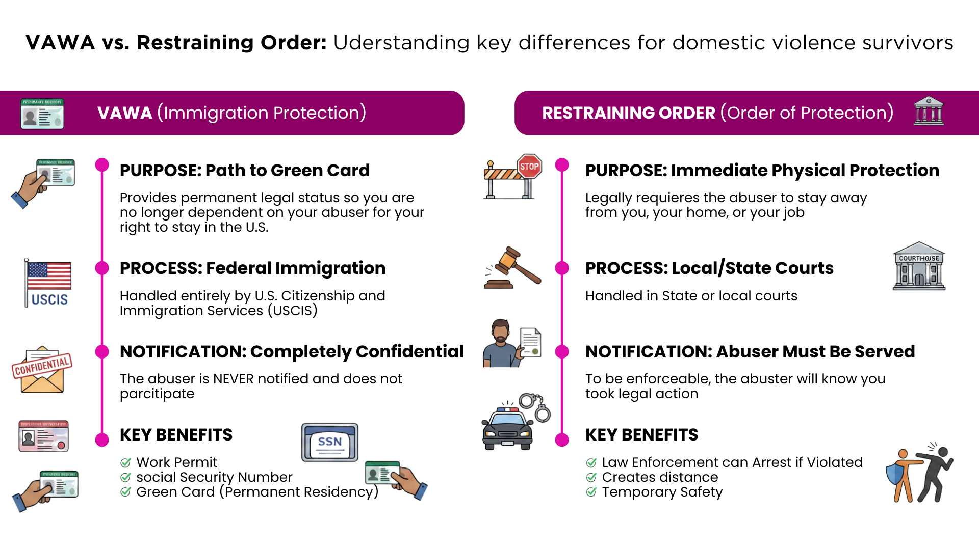 Think of a restraining order as a physical shield for your immediate safety, while VAWA is a legal shield for your long-term future in this country.