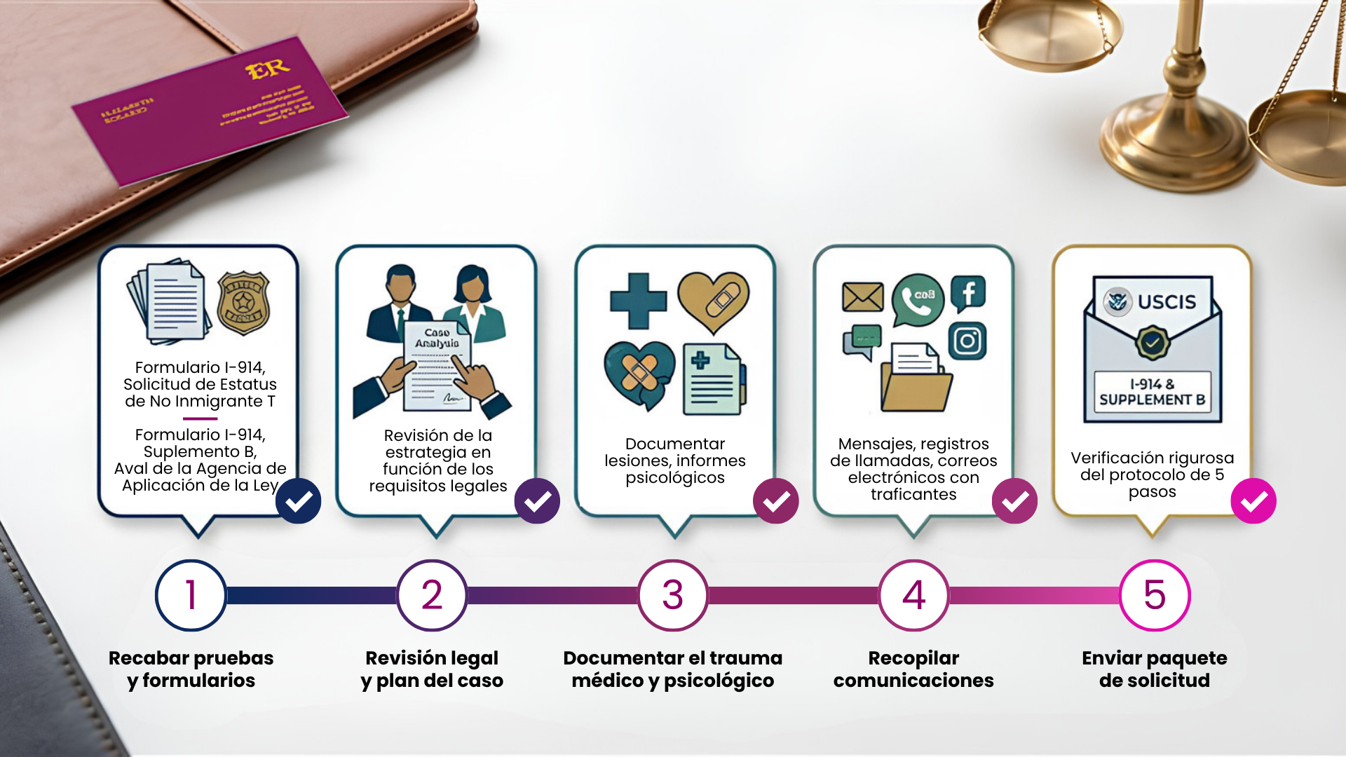 Para solicitar la Visa-T, USCIS evalúa cuatro pilares fundamentales, a continuación explicamos la intención legal de estos requisitos y cómo nuestra firma legal le ayuda a presentar las pruebas necesaria sin revictimizar durante el proceso: