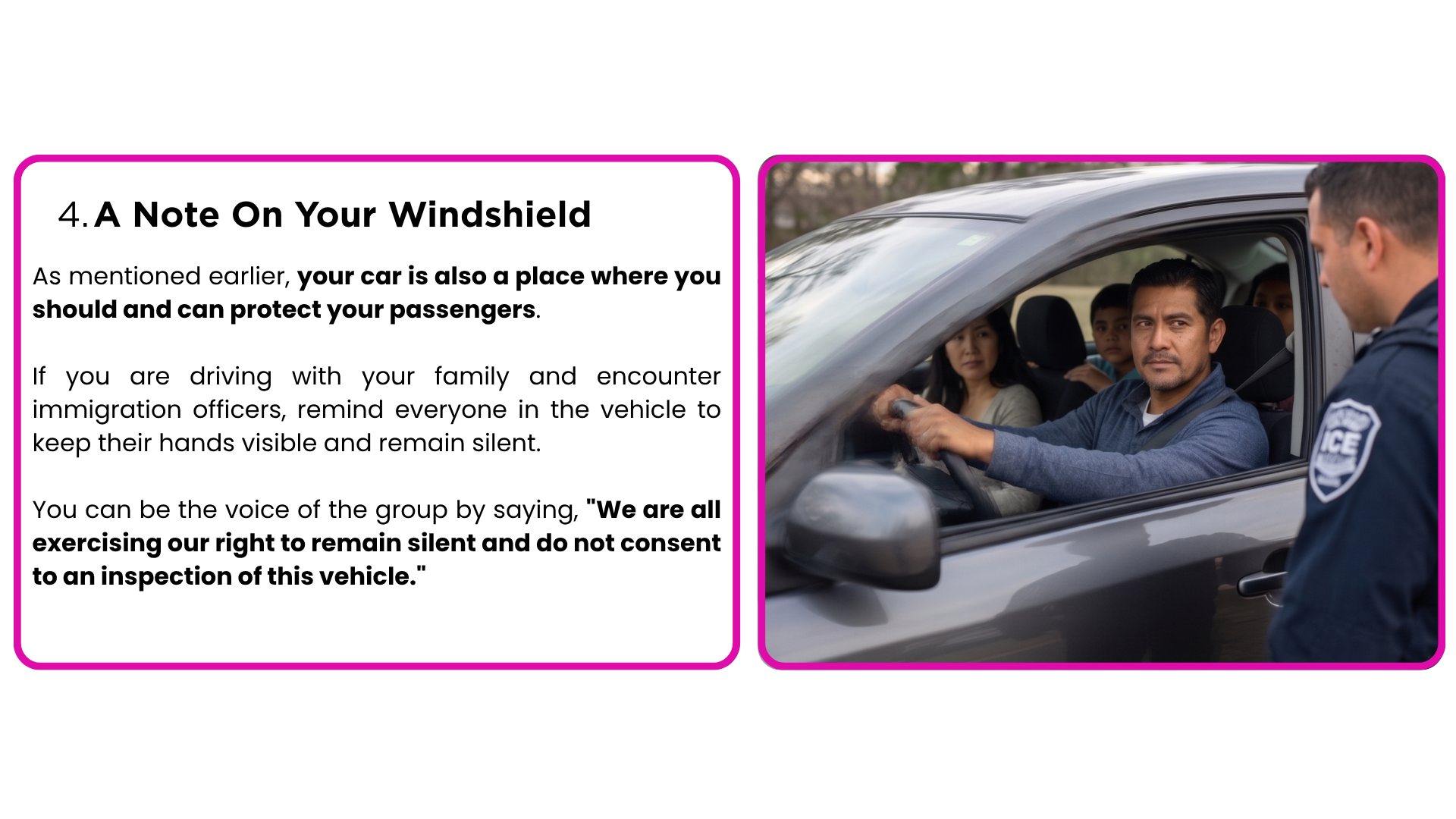 As we discussed earlier, your car is also a place where you must protect your passengers. If you are driving with family and are approached by ICE agents, remind everyone in the vehicle to keep their hands visible and to remain silent. You can be the voice for the group by stating: “We are all using our right to remain silent and we do not consent to a search of this vehicle”.